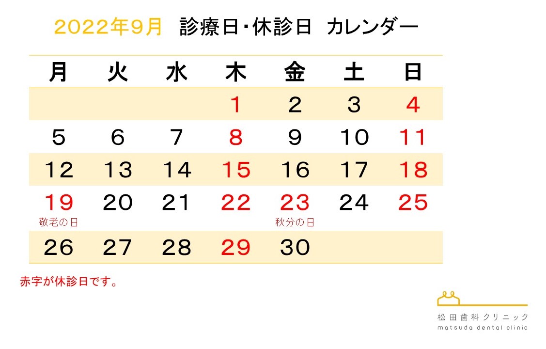 2022.08.29 | 2022年9月 診療日・休診日のお知らせ